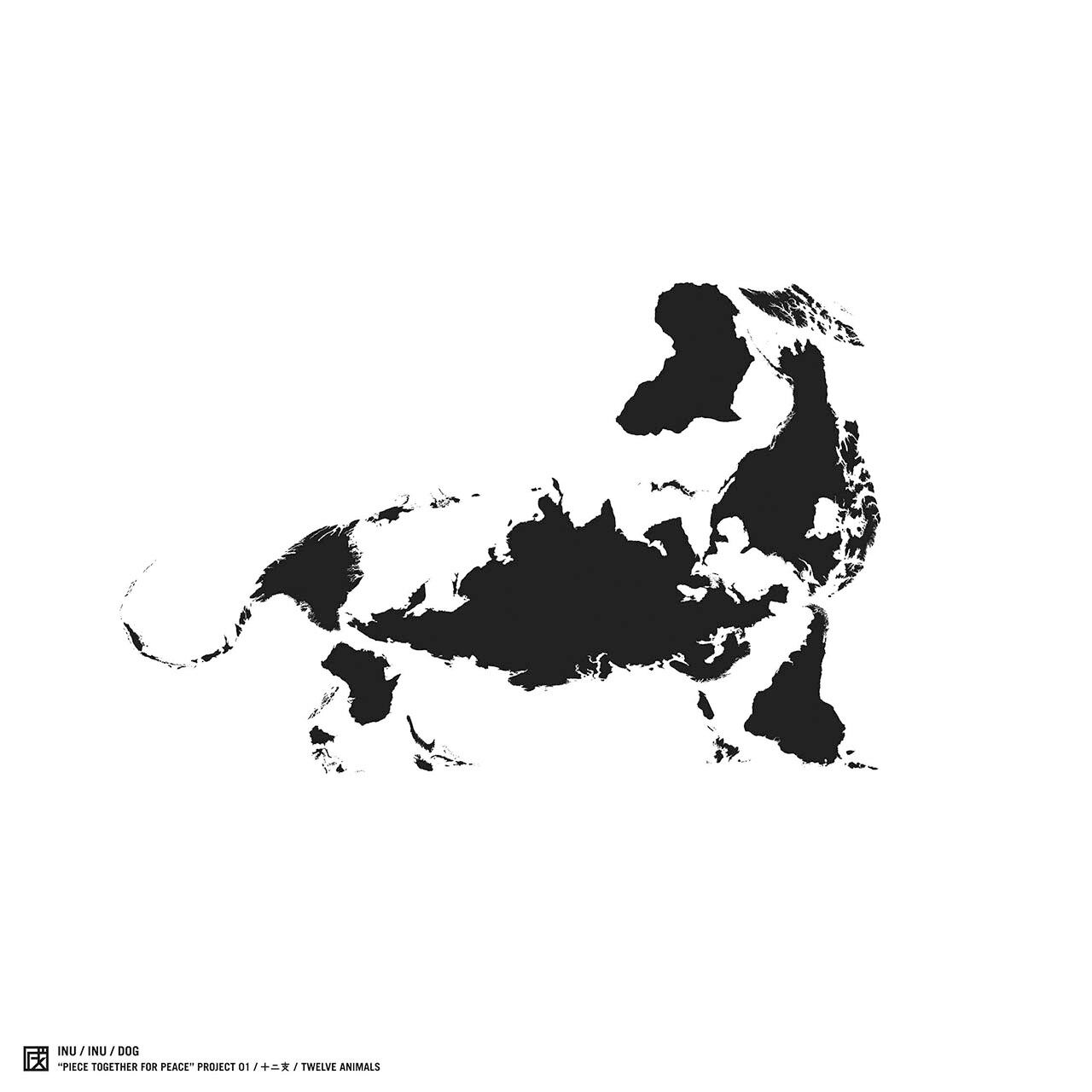 世界地図を分割し、回転と移動だけでモチーフを構成するPIECE TOGETHER FOR PEACE PROJECTより、十二支をモチーフにしたTWELVE ANIMALSシリーズ、DOGのポスター。